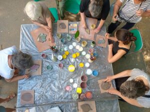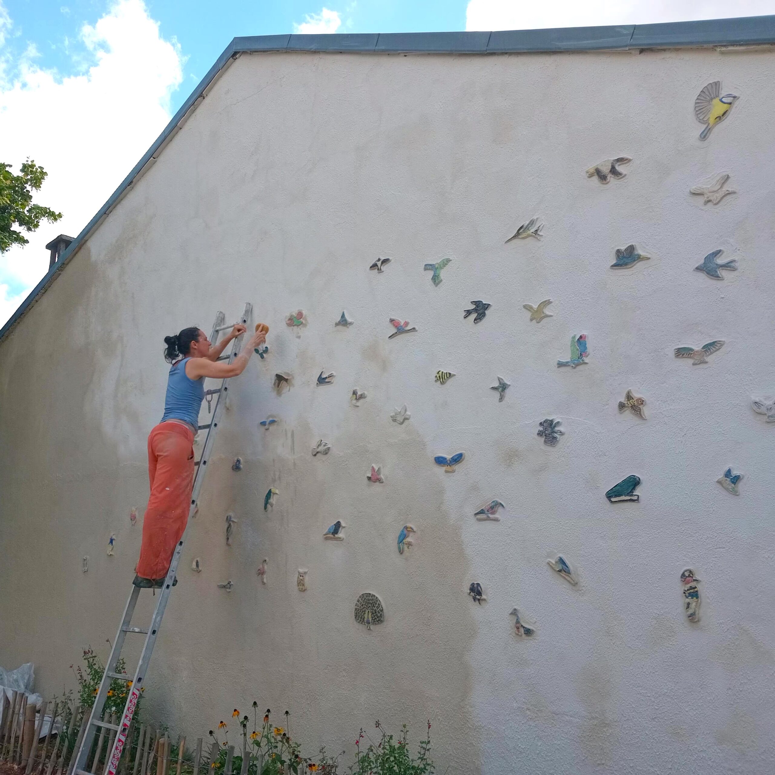 J’accompagne des créations collectives en céramique -fresque murale, installations verticales… – de la conception à la touche finale. Chaque création est imaginée et réalisée en fonction du lieu et de la nature des participants.