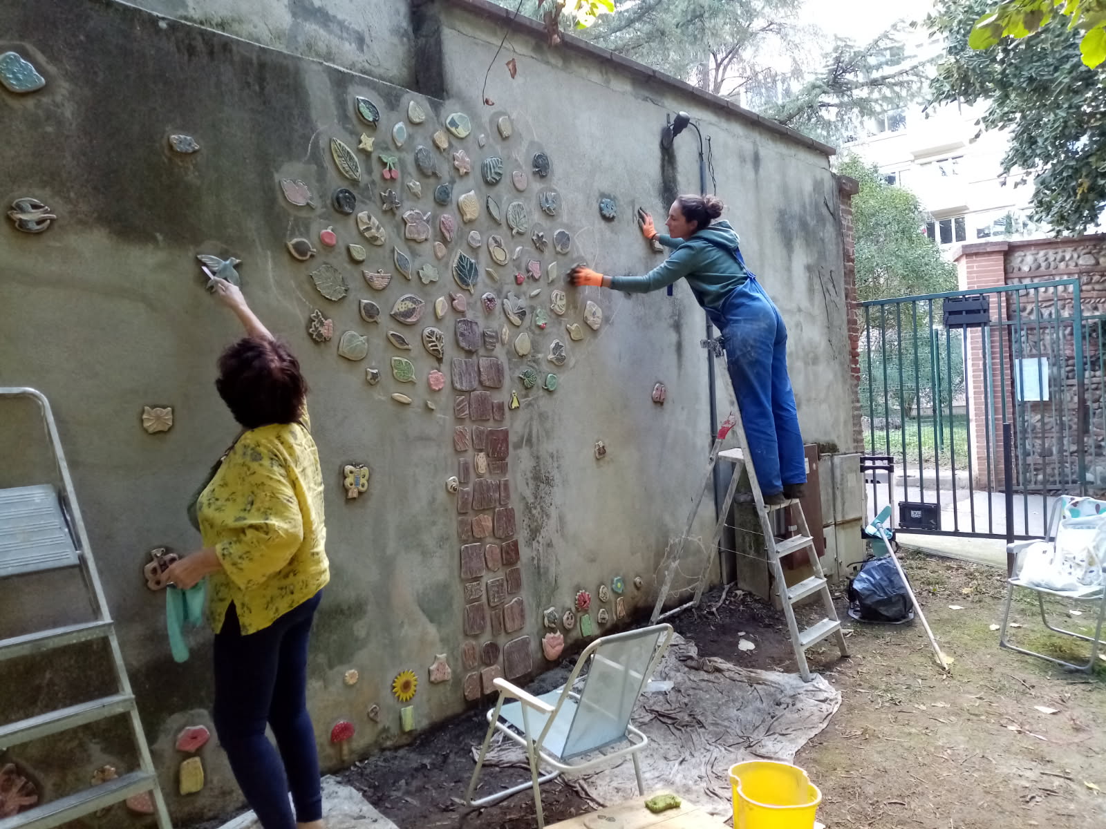 Création collective en céramique par plus de 50 habitants de 4 à 85 ans, dans le parc de Bourrassol, Toulouse. Réalisation soutenue par le dispositif Agir dans mon quartier
