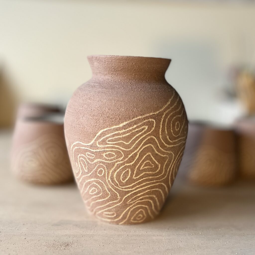Je pratique principalement le tournage et le modelage. Je travaille à la fois la faïence, le grès et la porcelaine, en fonction des propriétés que je recherche pour les objets que je crée.